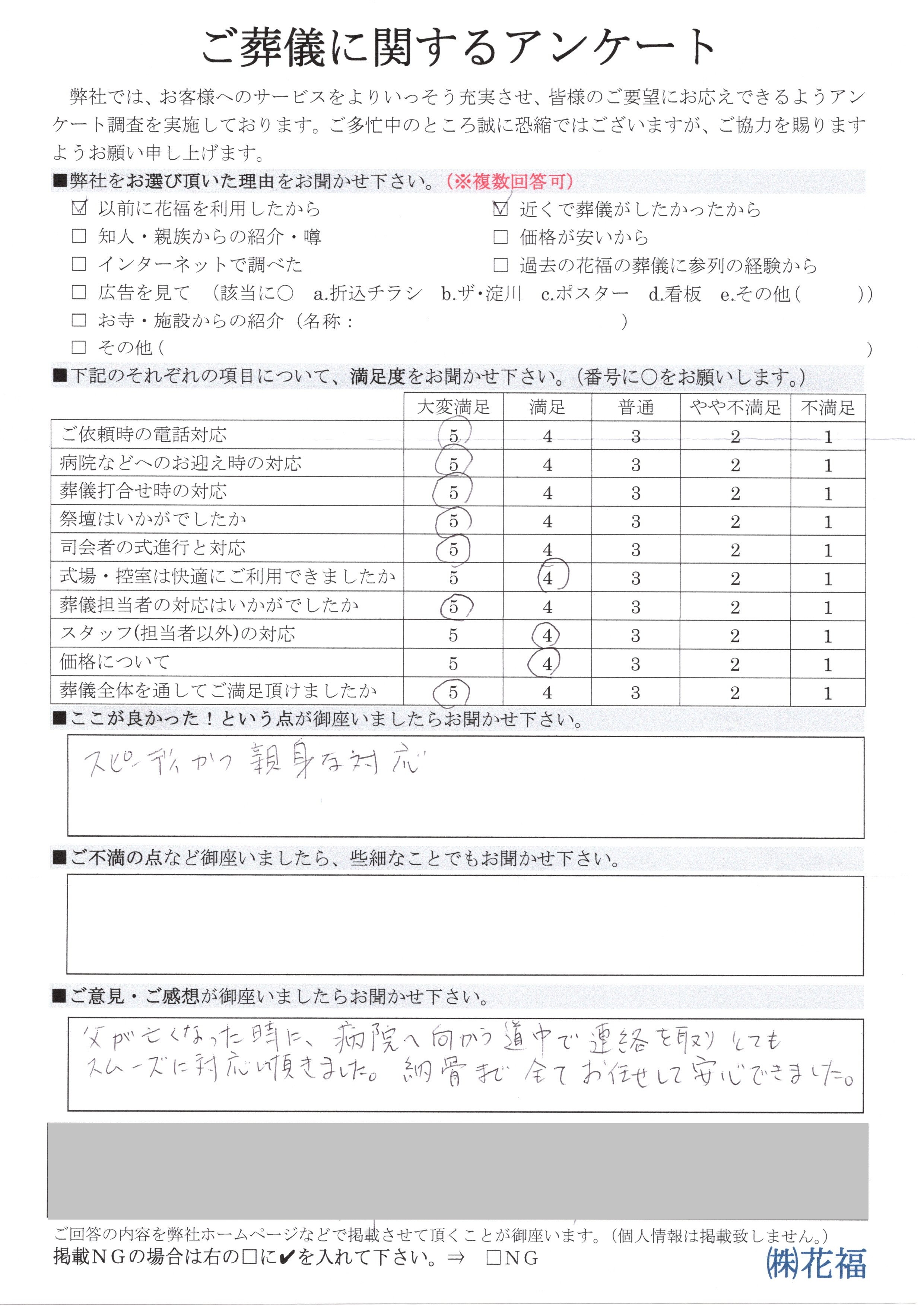 お客様の声 HOME お客様の声 大阪市淀川区東三国 U様 納骨まで全てお任せして安心できました。 大阪市淀川区東三国 U様納骨まで全てお任せして安心できました。 ご利用プラン その他のプラン ご利用式場 社会福祉会館 新東三国社会福祉会館 お住まいの地域 大阪市淀川区東三国 U様 スピーディーかつ親身な対応 父が亡くなった時に、病院で向かう道中で連絡を取りとてもスムーズに対応して頂きました。 納骨まで全てお任せして安心できました。