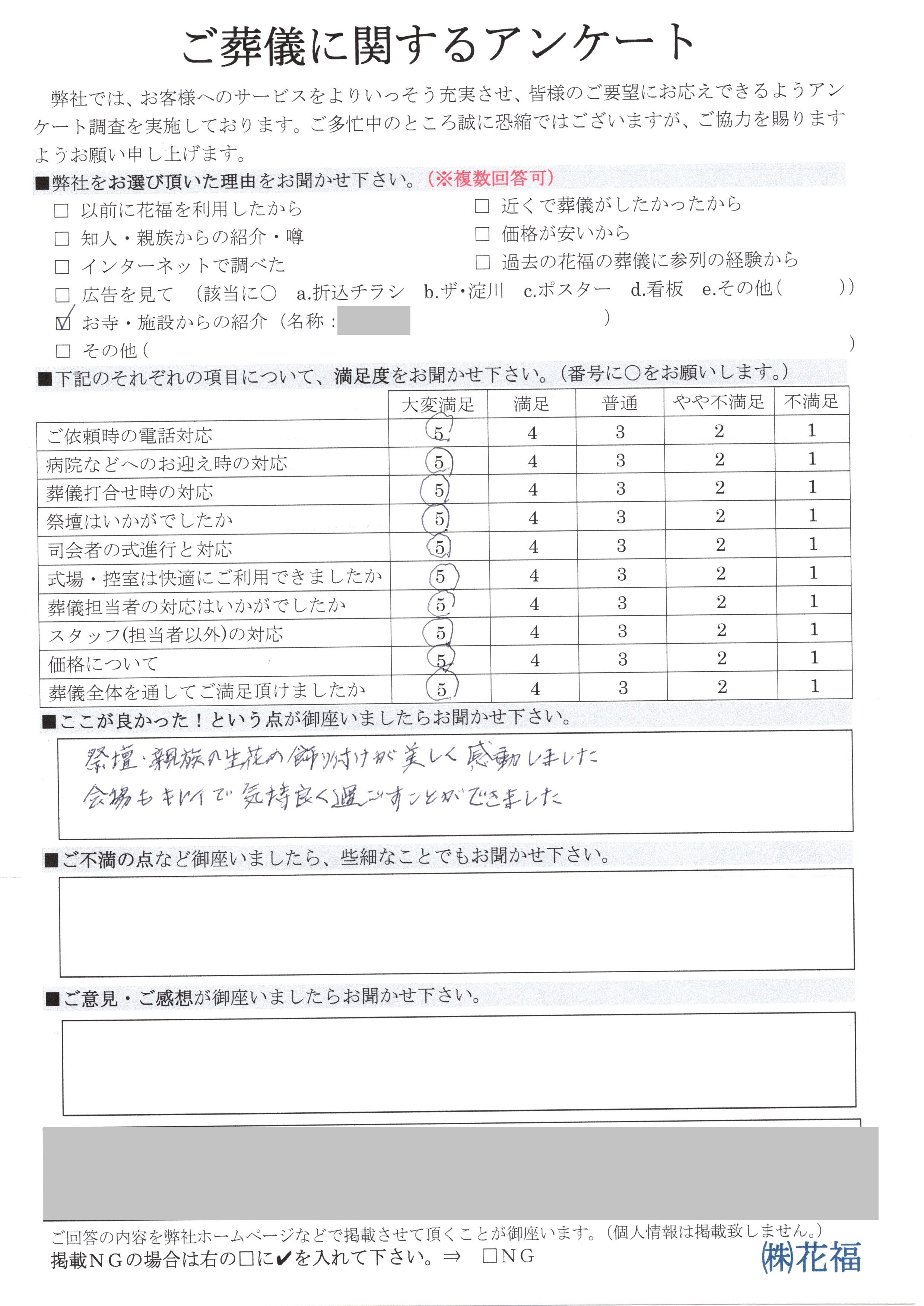 お客様の声 HOME お客様の声 大阪市淀川区東三国 K様 祭壇、親族の生花の飾り付けが美しく感動しました 会場もキレイで気持ち良く過ごすことができました 大阪市淀川区東三国 K様祭壇、親族の生花の飾り付けが美しく感動しました 会場もキレイで気持ち良く過ごすことができました ご利用プラン 一日葬ベーシック55 ご利用式場 家族葬ホール みくにの里 お住まいの地域 大阪市淀川区東三国 K様 祭壇、親族の生花の飾り付けが美しく感動しました 会場もキレイで気持ち良く過ごすことができました