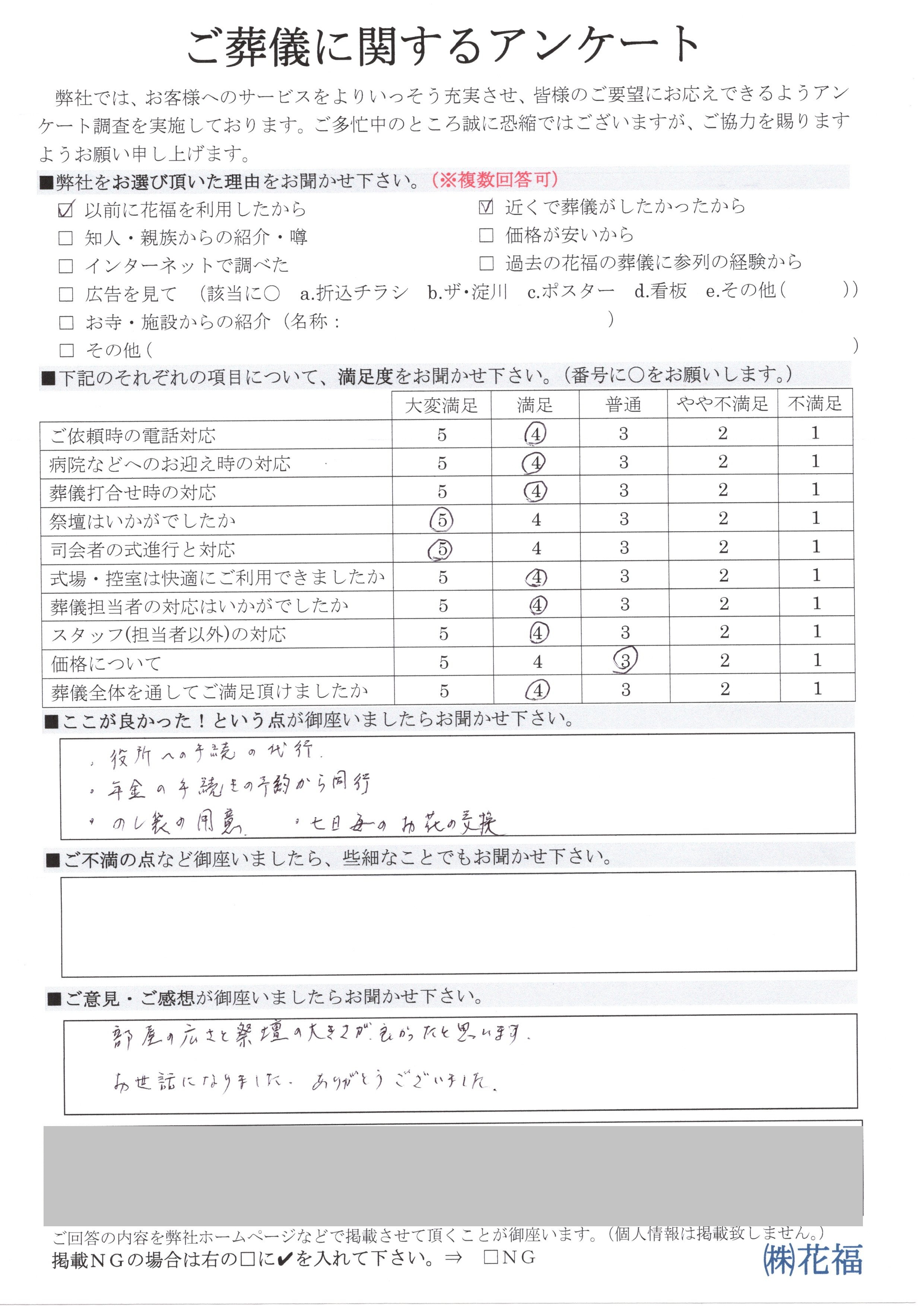 お客様の声 HOME お客様の声 大阪市淀川区西三国 B様 役所への手続きの代行 年金の手続きの予約から同行 のし袋の用意、七日毎のお花の交換 大阪市淀川区西三国 B様役所への手続きの代行 年金の手続きの予約から同行 のし袋の用意、七日毎のお花の交換 ご利用プラン 通夜式・告別式エレガンス95 ご利用式場 家族葬ホール みくにの里 お住まいの地域 大阪市淀川区西三国 B様 役所への手続きの代行 年金の手続きの予約から同行 のし袋の用意、七日毎のお花の交換 部屋の広さと祭壇の大きさが良かったと思います お世話になりました。ありがとうございました。