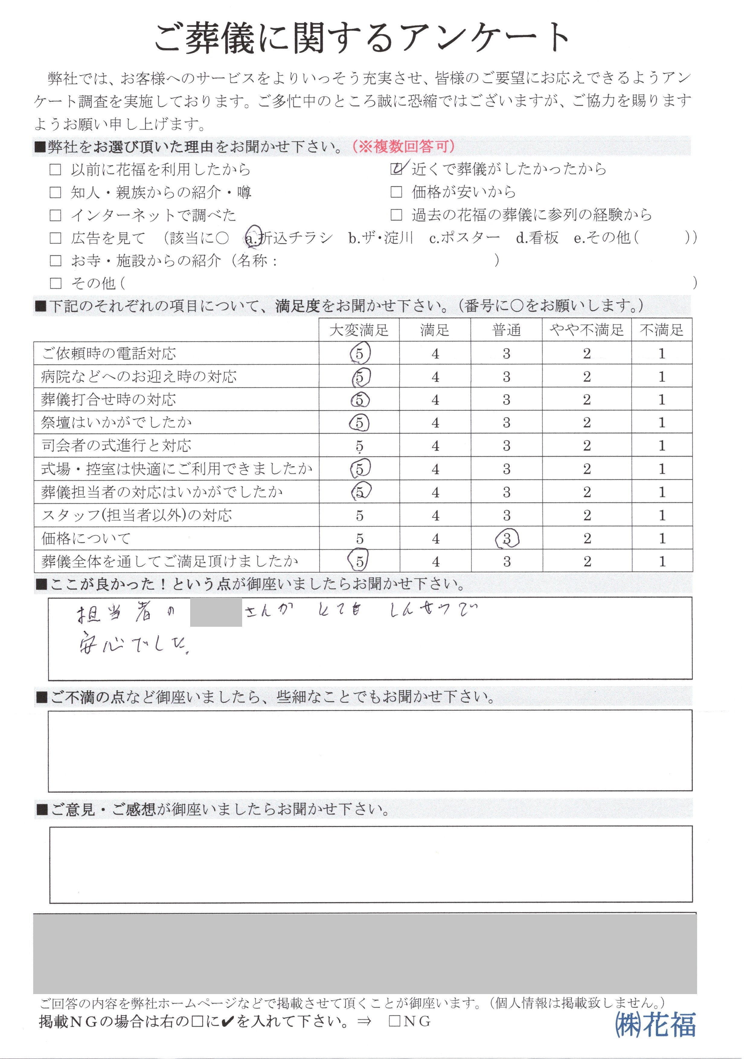 お客様の声 HOME お客様の声 大阪市淀川区西三国 S様 担当者の○○さんがとてもしんせつで安心でした。 大阪市淀川区西三国 S様担当者の○○さんがとてもしんせつで安心でした。 ご利用プラン 火葬式16 ご利用式場 花福法要ホール お住まいの地域 大阪市淀川区西三国 S様 担当者の○○さんがとてもしんせつで安心でした。