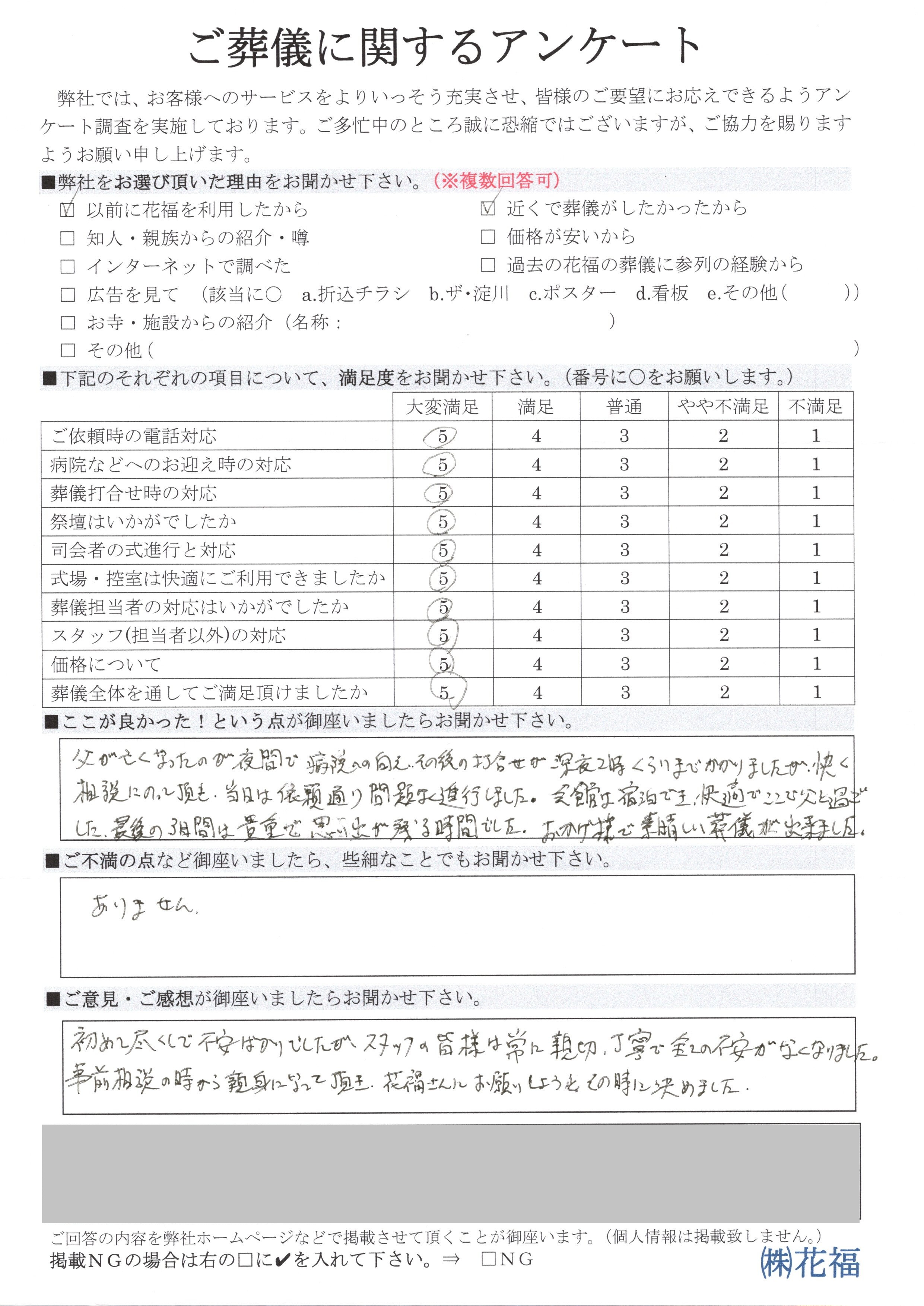 父が亡くなったのが夜間で病院への向かえ、その後の打合せが深夜2時くらいまでかかりましたが、快く相談にのって頂き、当日は依頼通り問題なく進行しました。
